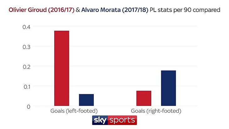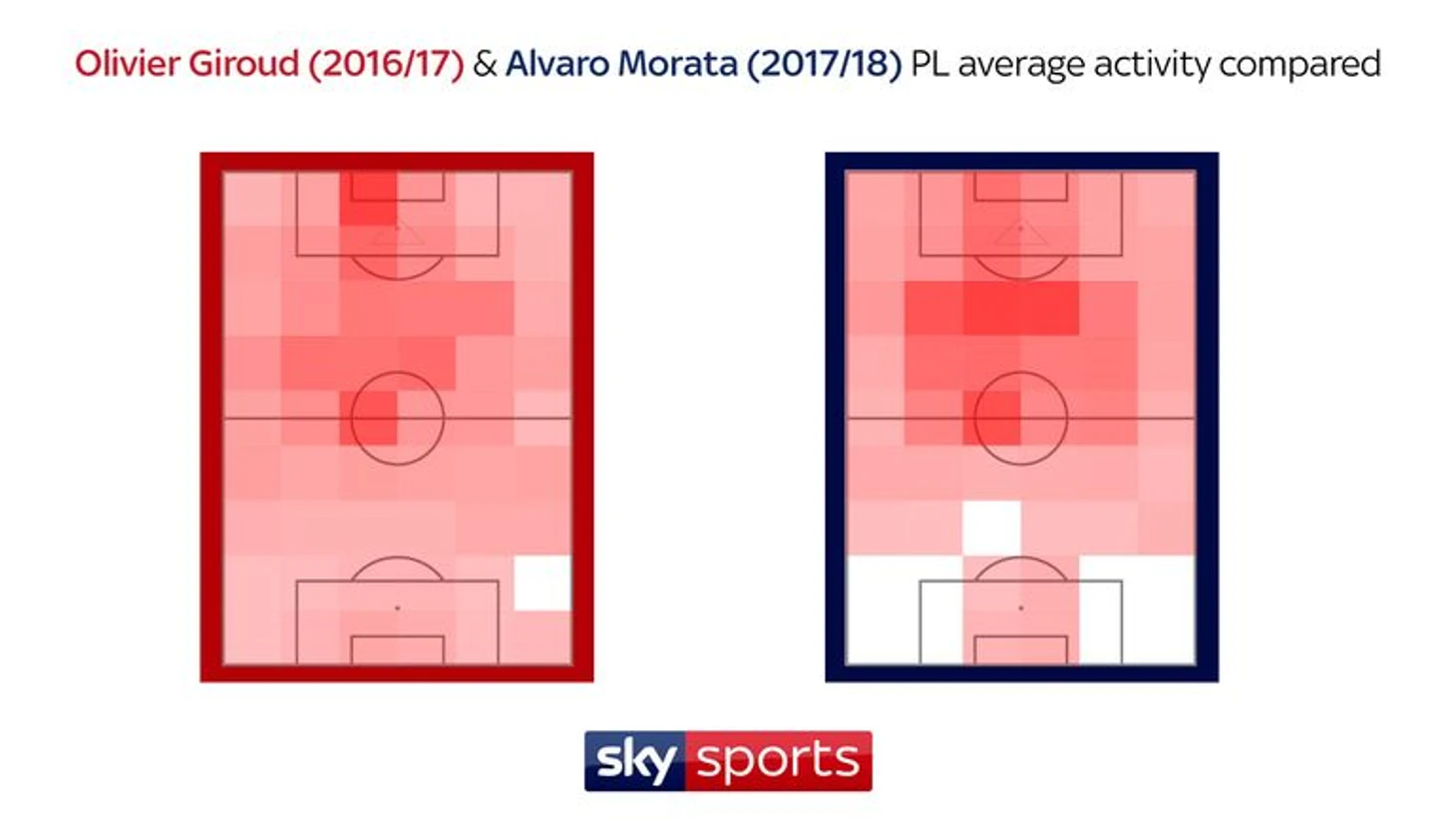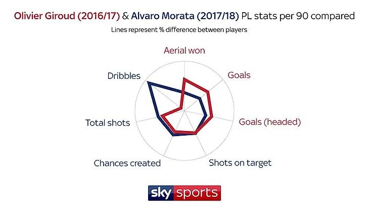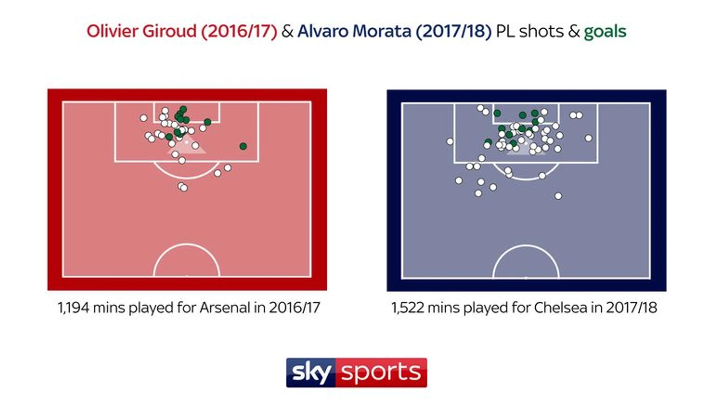 Жиру образца прошлого сезона явно превосходит Морату по голам, верховым забитым мячам и выигранным воздушным единоборствам. Но испанец имеет преимущество по количеству нанесенных ударов в створ, а также созданных моментов и удачных обводок.