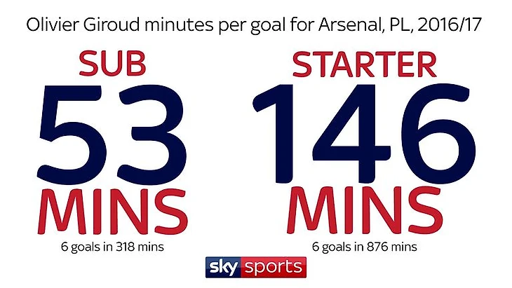 Разумеется, Жиру хочет забронировать за собой место основного нападающего сборной Франции на Чемпионате мира этим летом, но помешать ему может один статистический факт — он забивает больше, выходя на замену, чем в стартовом составе, — 53 минуты на гол (замена) и 146 минут (стартовый состав).