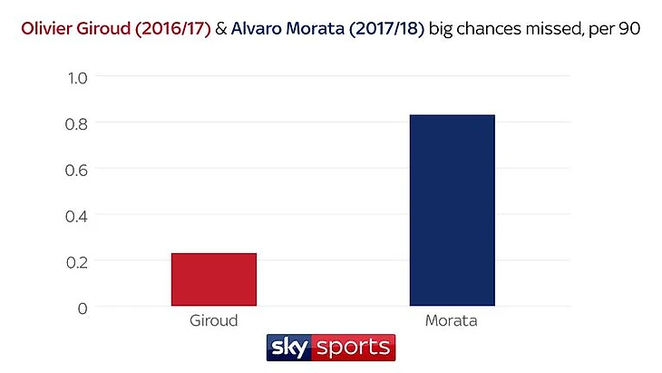 Наконец, Жиру лучше реализует очевидные голевые моменты. В этом сезоне Мората не использовал 0,8 момента за игру, тогда как Жиру всего лишь 0,2 за весь прошлый сезон.