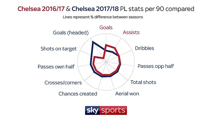 Однако, вместо 2,2 голов в среднем за игру в прошлом сезоне, в этом — только 1,8. В то же время «Челси» более чем в два раза улучшил средний показатель забитых мячей головой, чему поспособствовало воздушное мастерство Мораты.