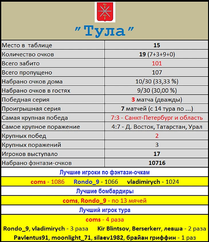 "Тула" Команда родного региона... тяжело, как капитану, мне видеть ее на дне турнирной таблицы... единственная сборная из этой четверки, что по ходу сезона пару раз поднималась так высоко - на места еврокубковой зоны... но, серия из 7 (се-ми!!!) поражений на финише года кинула эту команду в подвал турнирной таблицы... спасибо перерыву, что приостановил падение... может быть нашей сборной он пойдет на пользу... Отмечу, что матчи тульской команды - это всегда фифти-фифти... крупных побед и поражений в игре с туляками редко можно увидеть... цепкая, колючая для всех команда, но очень часто им не хватает для побед чуть-чуть командного мастерства игроков
