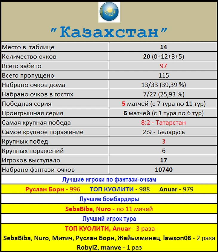 "Казахстан"... Серийная сборная)... может иметь баранку в графе очки после 6 туров... затем встрепенуться и выдать серию в 5 побед(!)... и опять задремать... в итоге эта синусоида результатов привела команду на 14 место... нужно добавлять в стабильности
