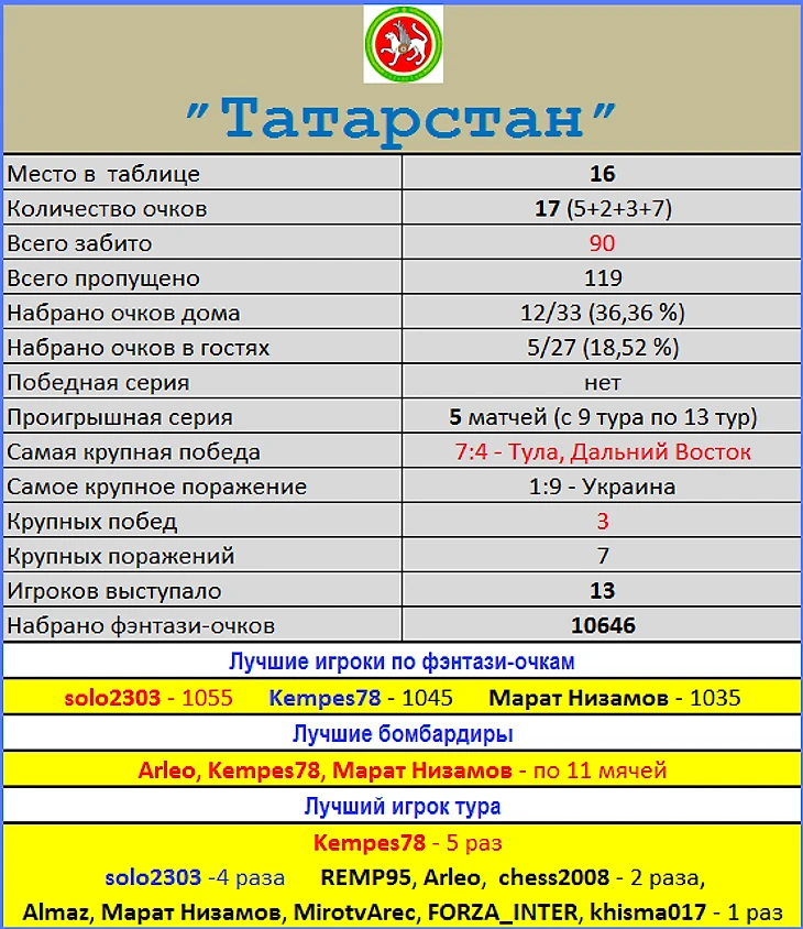 "Татарстан". О команде с 16-го места говорить позитивные фразы трудно... но вот не могу сказать, что это команда является на Спартакиаде "мальчиками для битья"... главная проблема у них в том, что и в таком скудном (по количеству игроков) составе очень много игроков-трупов в основе... а в меньшинстве играть и побеждать почти нереально... нужно усиление!... и тогда мы увидим что команда этого региона последнего слова еще на Спартакиаде не сказала... Удачи!