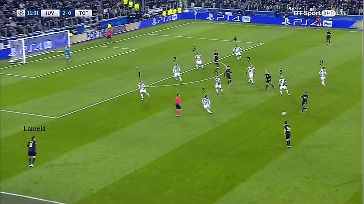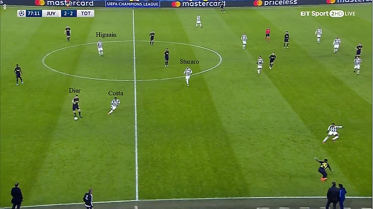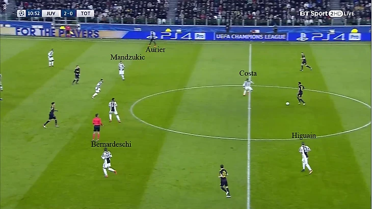 Тоттенхэм разыгрывает мяч у линии центра поля. Дембеле берёт игру на себя и начинает продвижение к воротам Ювентуса. Видя движение соперника, включается первая линия оборонительных построений "туринцев" - в отбор вступает один из форвардов в расстановке 4-4-2 (именно по ней защищался Ювентус). Однако Дугласу Косте не удаётся отобрать мяч у Дембеле, и бельгиец, соответственно, идёт дальше. К слову, у Косты 6 попыток отбора и только 1 успешный.