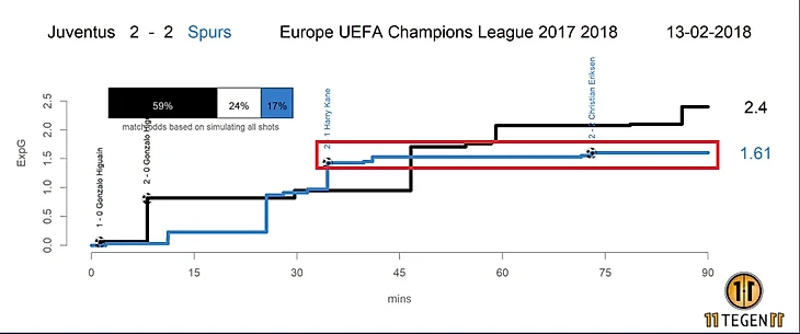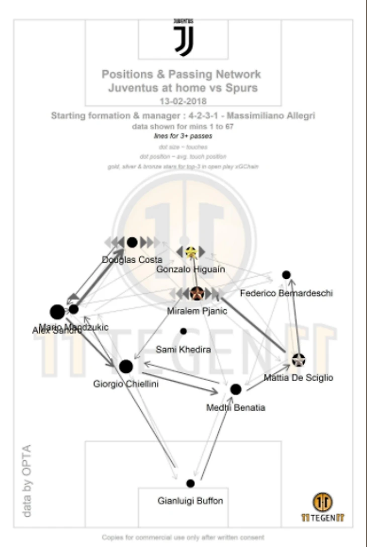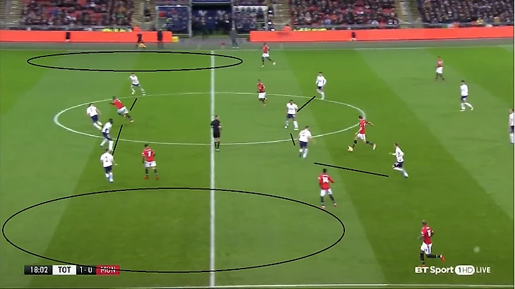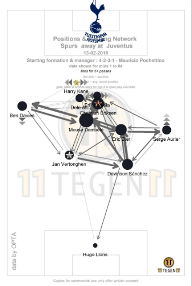 Настолько централизованное построение призвано "вытеснить" соперника на фланги, с которых сложнее атаковать. Задумка Аллегри в целом сработала - Тоттенхэм в первом тайме совершил 18 подач, сделал лишь одну передачу в пределах штрафной Ювентуса, а Кейн не выиграл ни одного верхового единоборства. Однако подопечные Почеттино всё равно изловчились сделать три точных проникающих паса в штрафную площадку Ювентуса, и после каждого из пасов были нанесены удары, один из котрых конвертировался в гол.