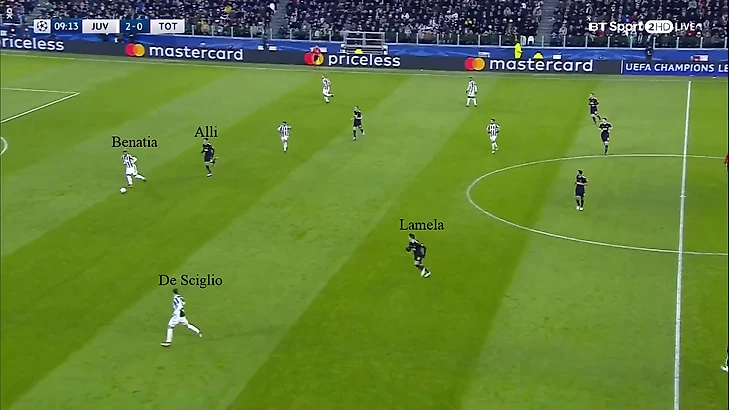 Ювентус разыгрывает у своих ворот. Алли преследует владеющего мячом Бенатиа. Под марроканца открывается Де Шильо, которого преследует Ламела.