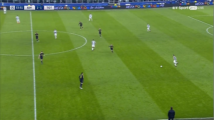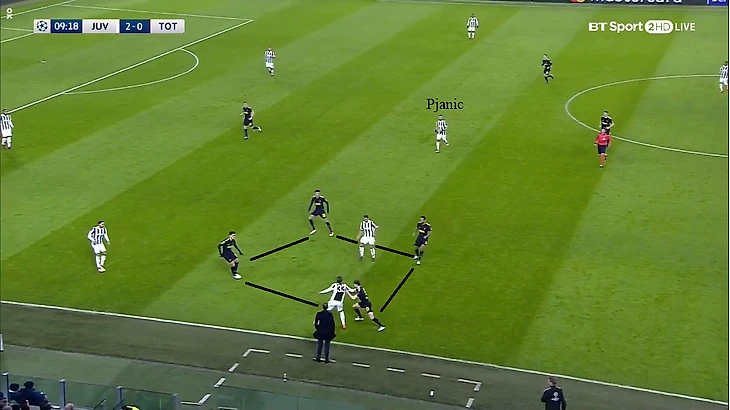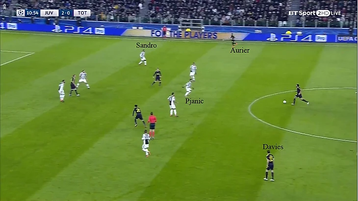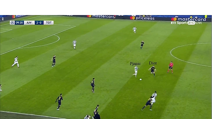 Отбор у Пьнича не вышел, но продвижение Тоттенхэма вперёд было приостановлено, так как Дембеле, видя перед собой две стены из игроков Ювентуса и понимая, что в обводку дальше идти бессмысленно, был вынужден отдать поперечный пас.