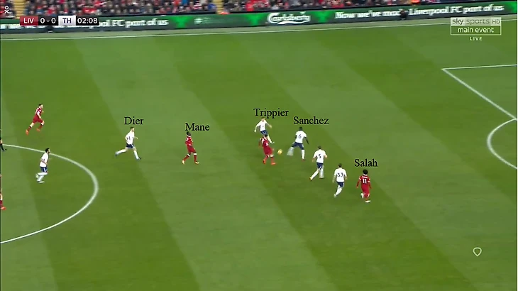 Дэвис, видя, что Бернардески - единственный игрок на его фланге (за Де Шильо отвечает Ламела), принимает решение преследовать оттянувшегося назад оппонента. Деле Алли в свою очередь теперь вплотную опекает Хедиру.