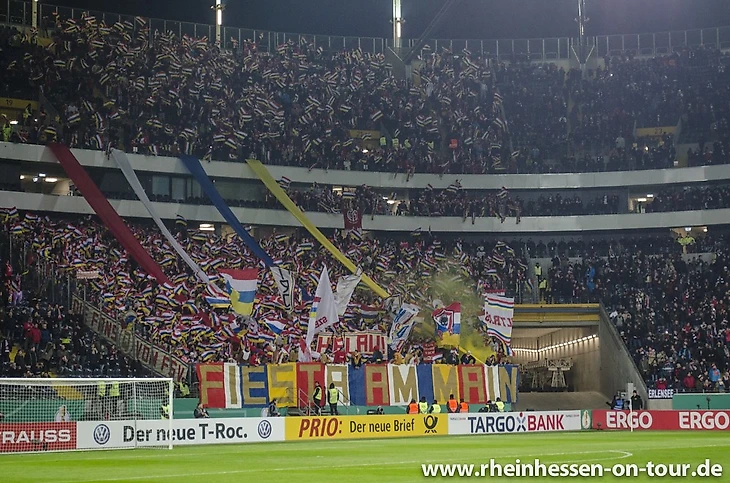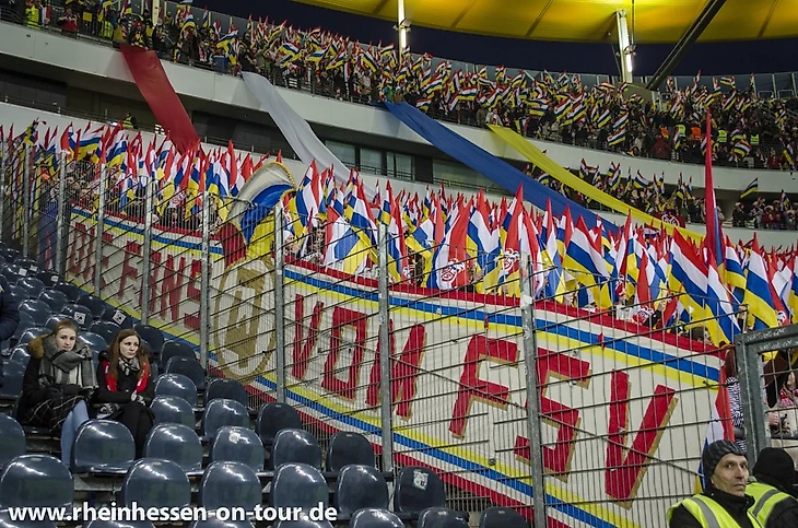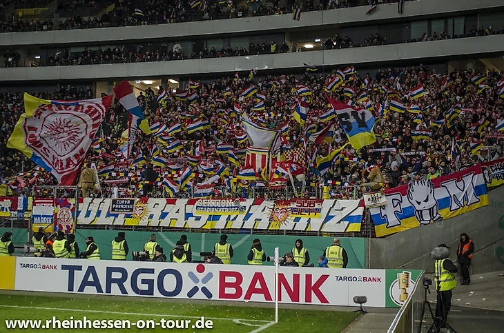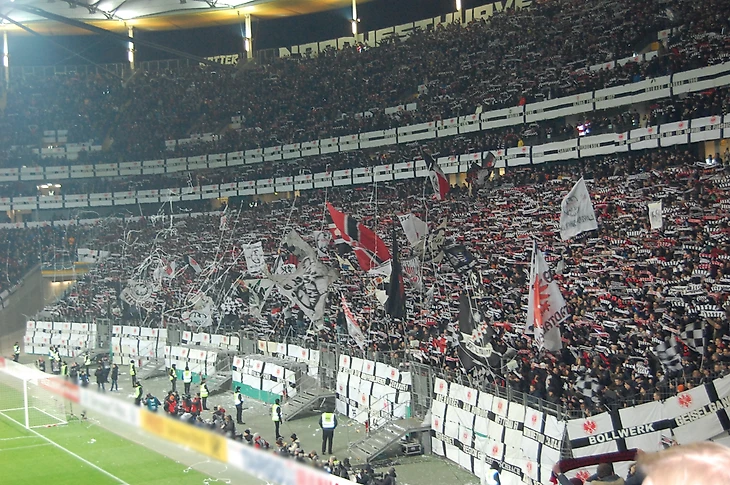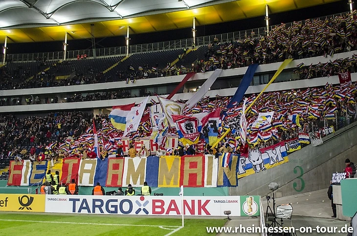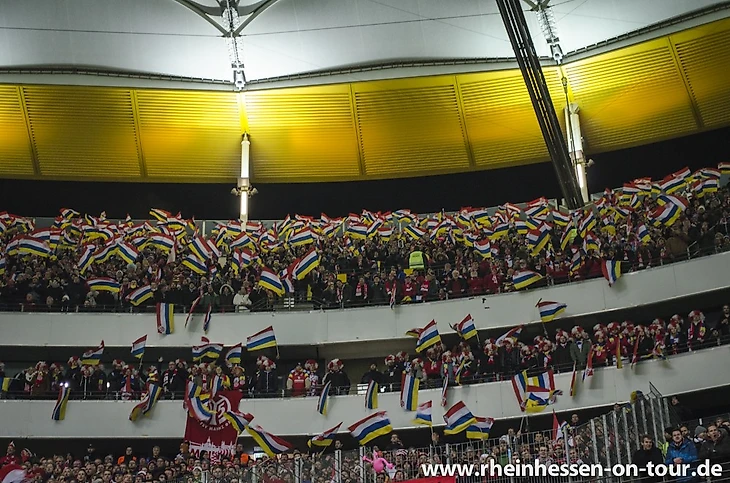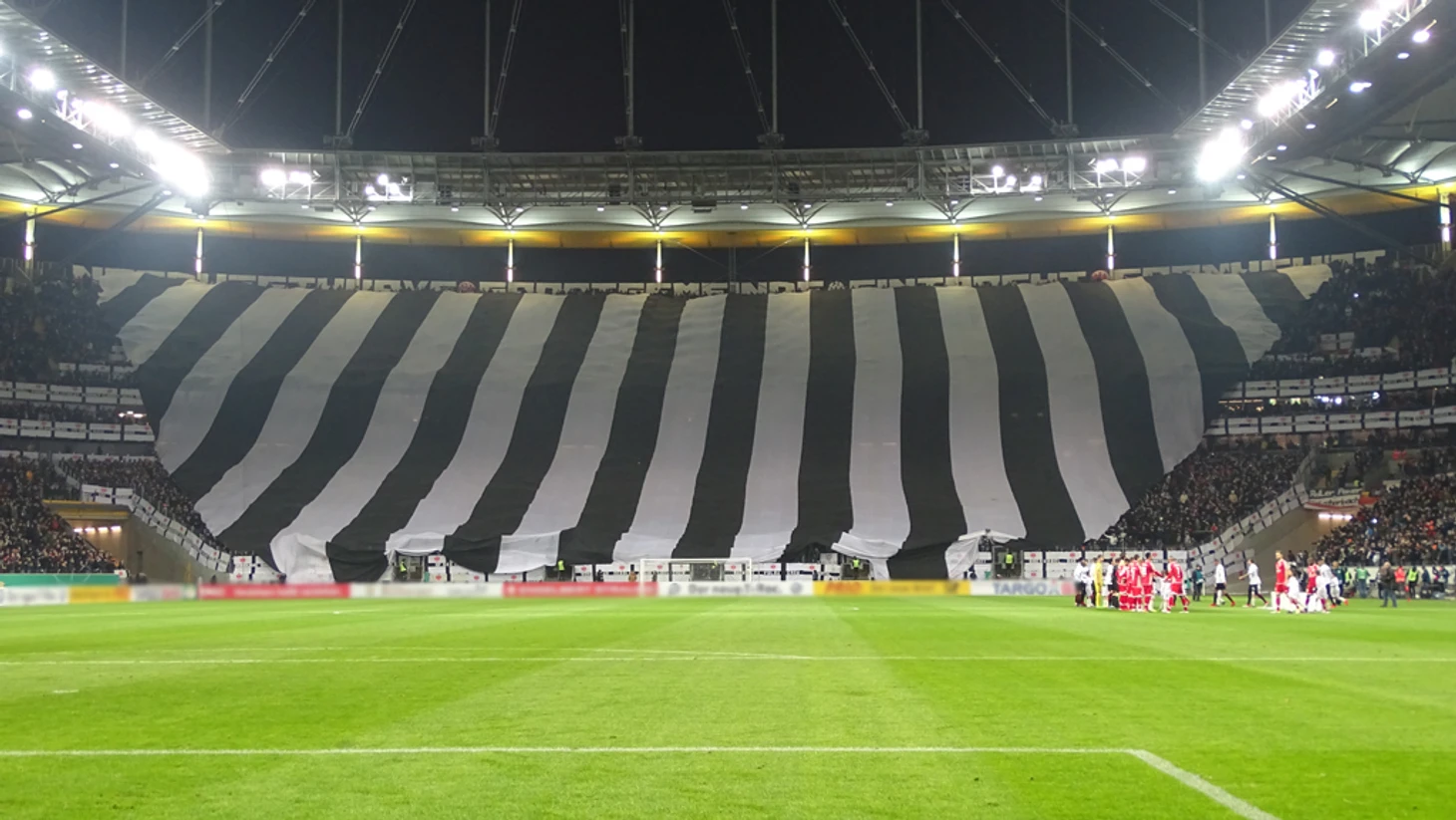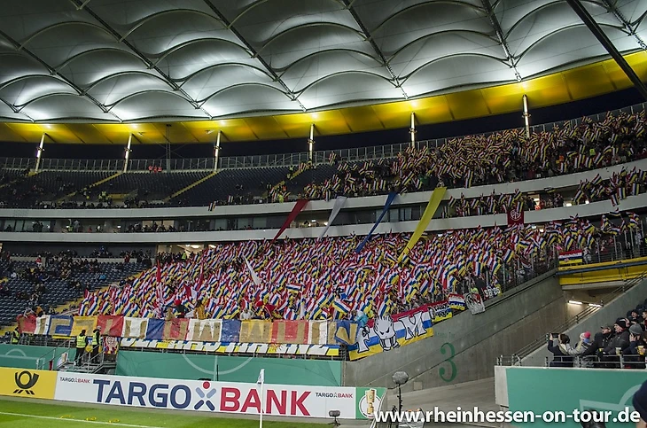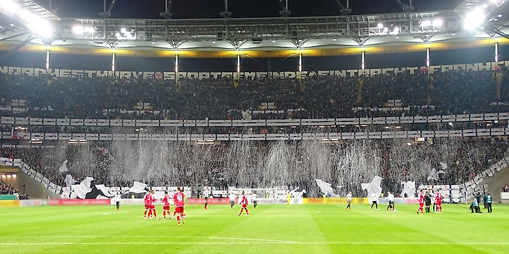 Надо сказать, что и фанаты "Айнтрахта" подошли к этому матчу очень ответственно, подготовив огромный чёрно-белый полосатый на всю трибуну, а также море лент.