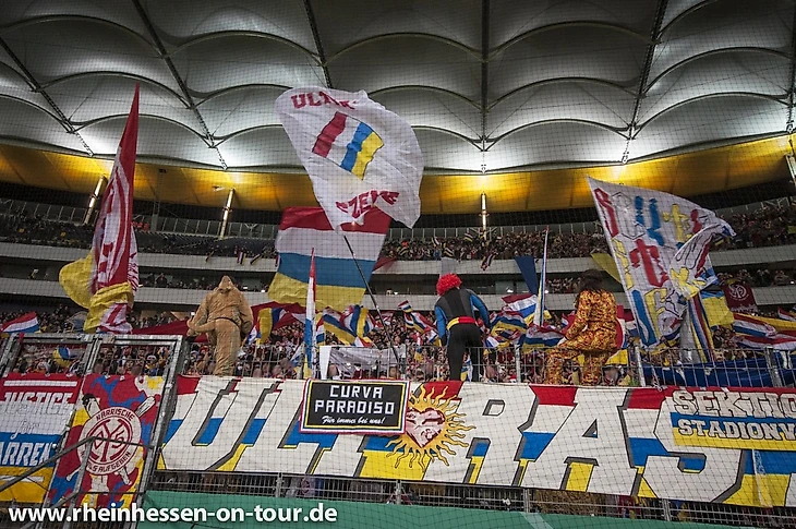 Довершили общую картину перфоманса лицевой баннер про "Фиесту", большие флаги, двуручники и вертикальные ленты на манер аргентинского суппорта. Также надо отметить, что специально для этого выезда и бригадные баннеры были перерисованы под карнавальный стиль всей трибуны.