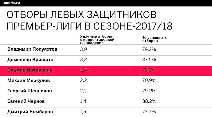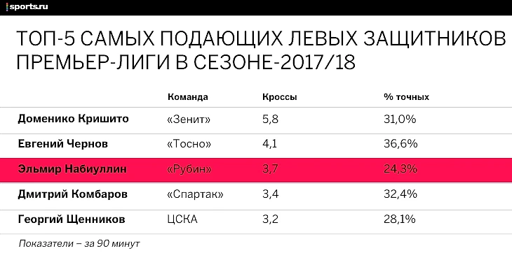 В первой части чемпионата Набиуллин входил в топ-5 среди левых защитников по количеству подач. Он уступает конкурентам в точности навесов, но в целом показатели Эльмира нормальны для российской лиги. В «Зените» Набиуллин точно будет совершать кроссы чаще, ведь команда Манчини – самая подающая в лиге (26,2 кросса за 90 минут, у «Рубина» – 14,8).