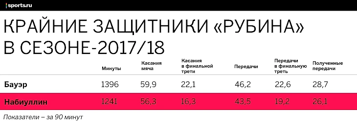 Разница в эффективности фланговых атак «Рубина» связана не только с инициативностью Набиуллина и Бауэра, но и с позициями, в которых крайние защитники казанцев встречались с мячом. Эльмир чаще получал мяч ближе к центральному кругу.