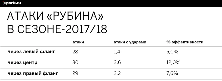 В сезоне-2017/18 «Рубин» старается атаковать сбалансированно, нет акцента на фланги или центр: 30 атак за матч проходят через середину, 29 – через правый край, 28 – через левый. Но несмотря на минимальный разрыв, после атак с левого фланга команда Бердыева била существенно реже, чем из других зон.