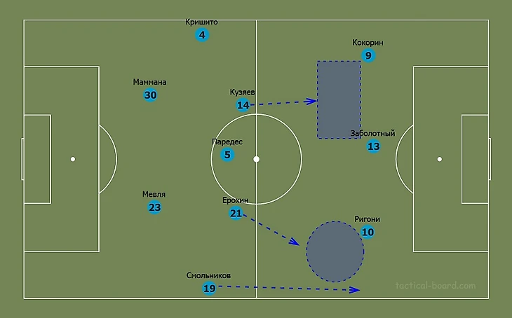 Главная причина провала в атаке абсолютно типична для нашей 4-3-3, все ровно тоже самое, что и осенью, когда эта схема стала главным символом осеннего спада. Группа атаки Ригони-Кокорин-Заболотный отрезана от остальной команд. Трио впереди действовало на одной горизонтальной линии офсайда, таким образом отсутствовал элемент между линиями 3-3, для доставки мяча группе атаки, а за передачи верхом цепляться было некому без поддержки.
