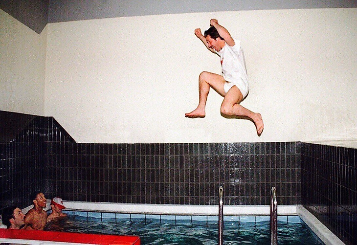 Голкипер канониров Дэвид Симен отрабатывает прыжки, 90-ые.