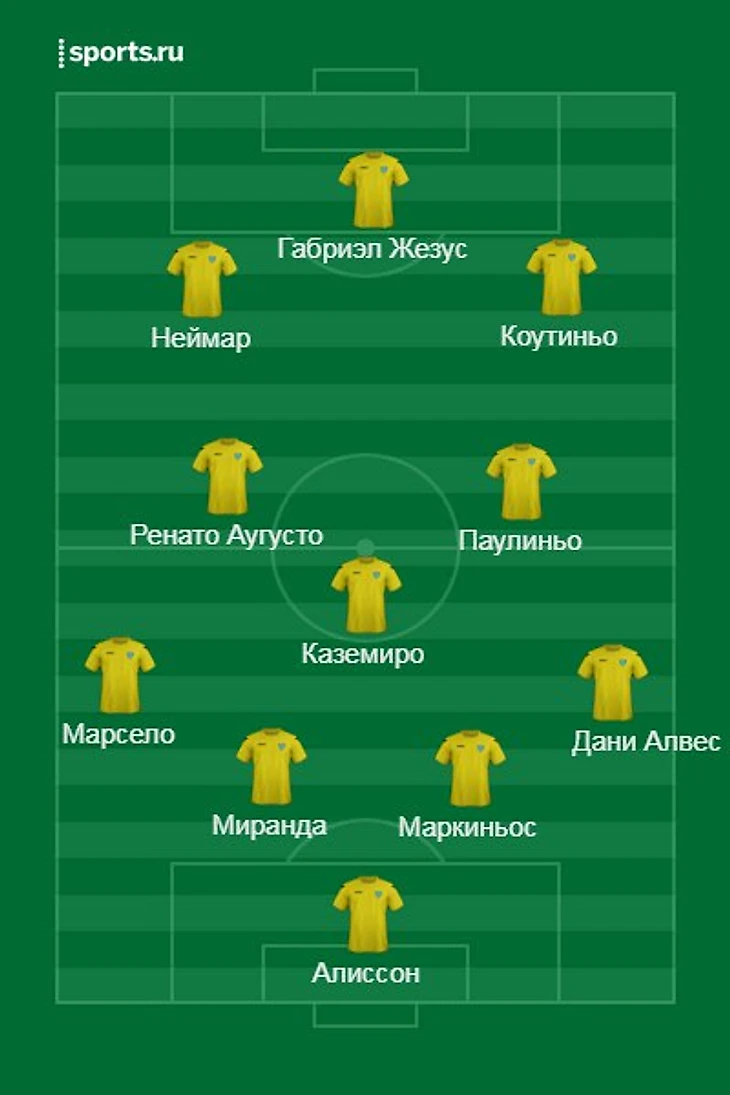 Алиссон (Эдерсон) – Дани Алвес, Маркиньос, Миранда (Тиаго Силва), Марсело (Алекс Сандро) – Каземиро (Фернандиньо) – Паулиньо, Ренато Аугусто – Коутиньо (Виллиан), Габриэл Жезус (Фирмино), Неймар