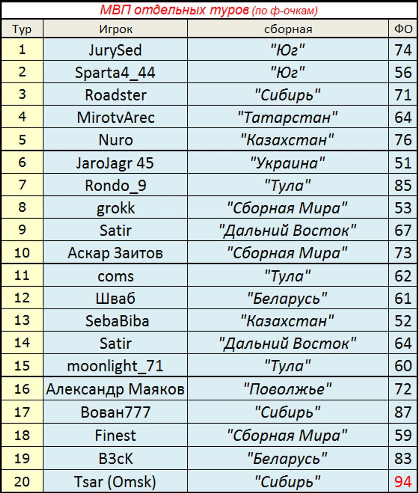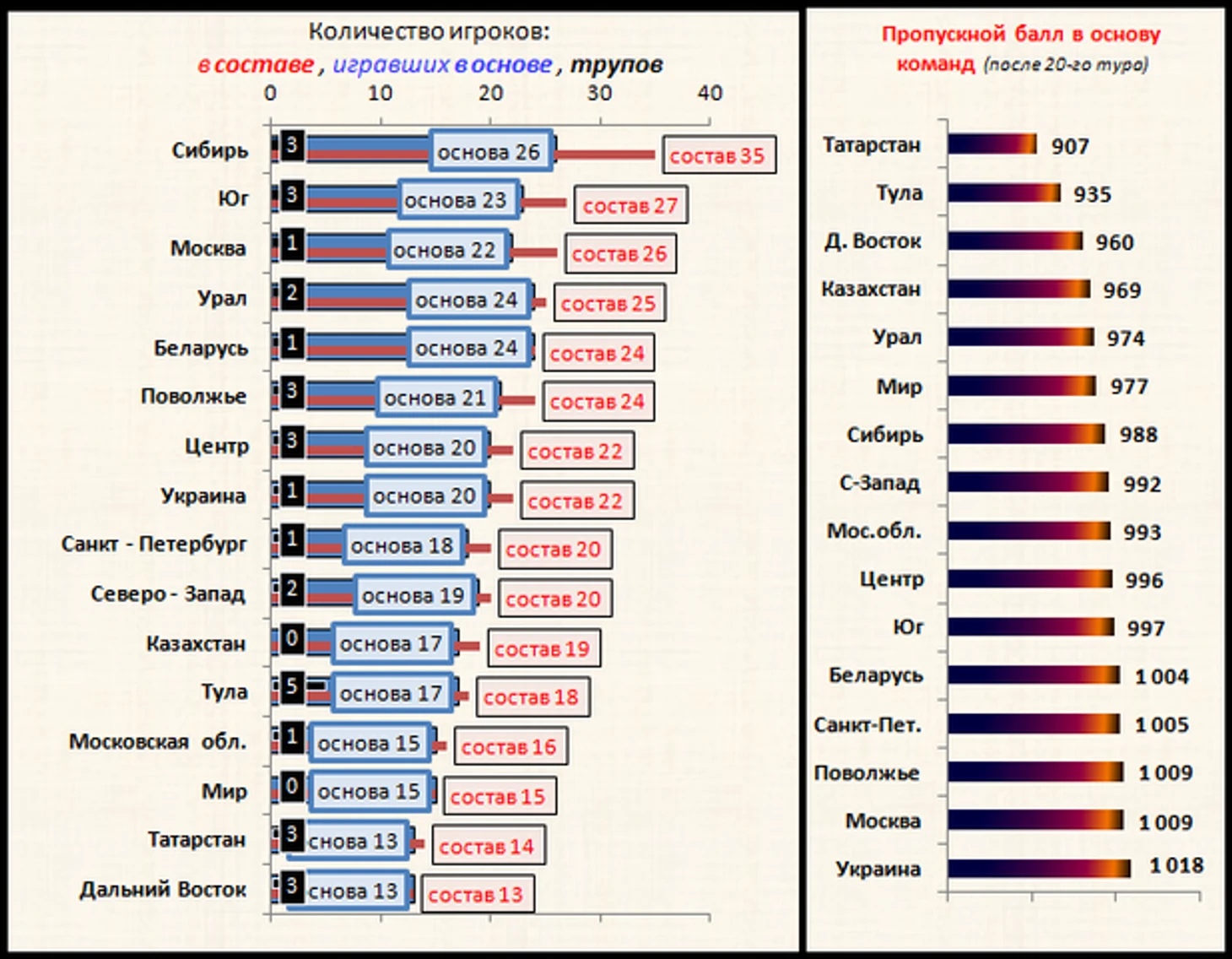 Как видим, с учетом скудного состава + наличие "трупов", особенно нуждаются в новых игроках сборные Д.Востока, Тулы, Татарстана... да и в других командах, я уверен, от хороших мастеров фэнтази то же вряд ли откажутся)... отмечу сборные Мира и Казахстана - в их составах, после 20 тура, нет игроков с "красной меткой" - все в строю!