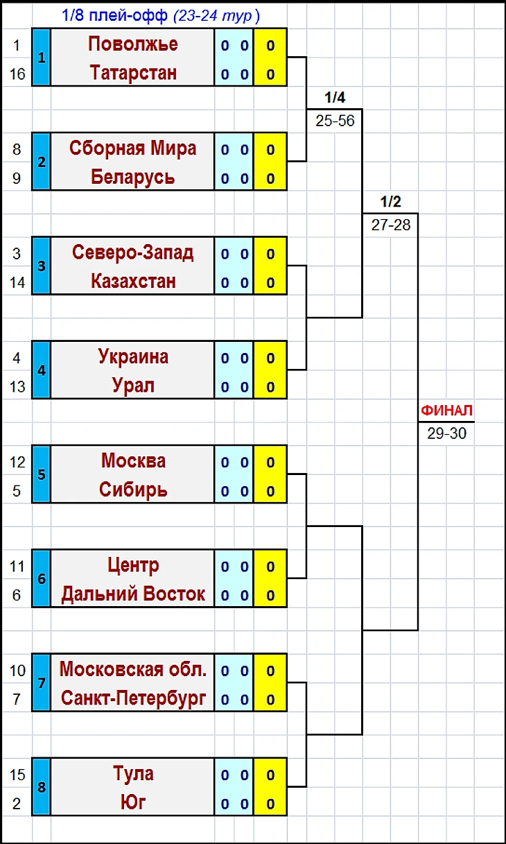 В случае равенства очков на каждом этапе плей-офф действует единый для всех командных турниров регламент.