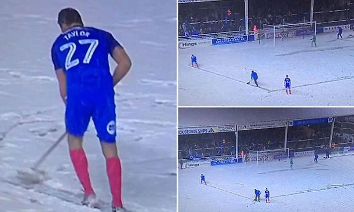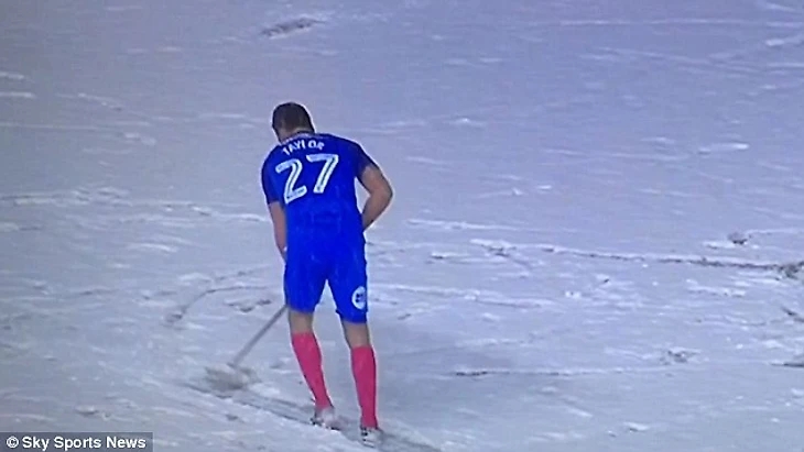 Защитник «Питерборо» Стивен Тэйлор бросился на помощь: экс-игрок «Ньюкасла» чистил снег щеткой для подметания пола.