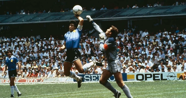 22 июня 1986 года в четвертьфинале мундиаля встречались Аргентина и Англия. После первого тайма бескомпромиссной борьбы в начале второй половины стадион взрывается в эмоциях. Аргентинцы подскочили вверх от восторга, а англичане от негодования. После неудачного выноса Стивена Ходжа маленький Диего Марадона умудрился перепрыгнуть в воздухе вратаря Питера Шилтона, который был на 20 сантиметров выше нападающего. Британцы стали сигнализировать судье об очевидной игре рукой, однако арбитр посчитал, что гол был забит чисто. Сам виновник инцидента, несмотря на все фото и видеодоказательства, в интервью заверил, что он не касался мяча. В последствии этот эпизод стал самым известным примером мошенничества и нечестной игры в футболе. Никто кроме аргентинца до сих пор не осмелился настолько нахально и упрямо отрицать столь явное нарушение правил.