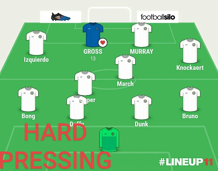 "Брайтон" сумел подарить своим болельщиком яркую на эмоции осень и беспроигрышную домашнюю серию из шести матчей. В основе игры команды лежала схема 4-4-1-1, в которой Паскаль Гросс действовал под Гленном Мюрреем. Однако позиция полузащитника не была закреплена в центральной зоне, очень часто он смещался на фланги чтобы выполнить подачу в штрафную. Смещался он настолько часто, что на сегодня является четвертым игроком Премьер-лиги по среднему количеству кроссов за матч. Как я уже говорил, подачи немца в совокупности с чувством позиции Мюррея приносили команде результат и даже вывели на девятое место в чемпионате к 13 туру АПЛ.