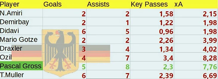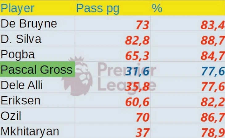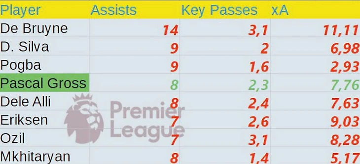 В плане статистики Гросс попадает в элиту плеймейкеров АПЛ. Показатели эффективности пасов немца сопоставими с парнями, чья рыночная стоимость давно перевалила за сотню миллионов долларов.
