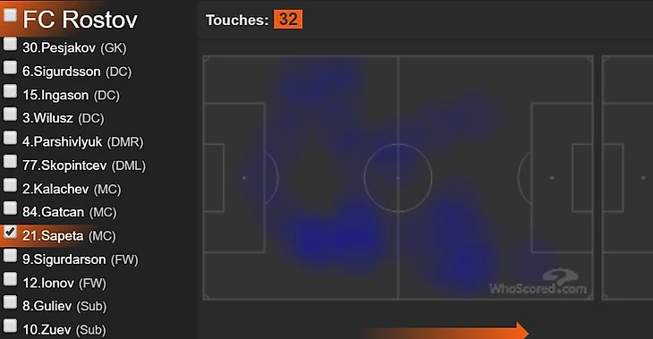 Так вот, суть заключается в том, что в этом матче Сапета являлся чистым опорником или составлял сдвоенную опорную зону вместе с Гацканом. Во многом это зависело от капитана команды, потому что в этом матче он очень часто выдвигался вперед.