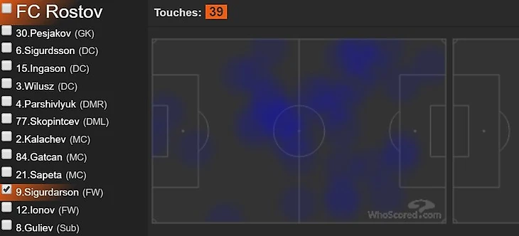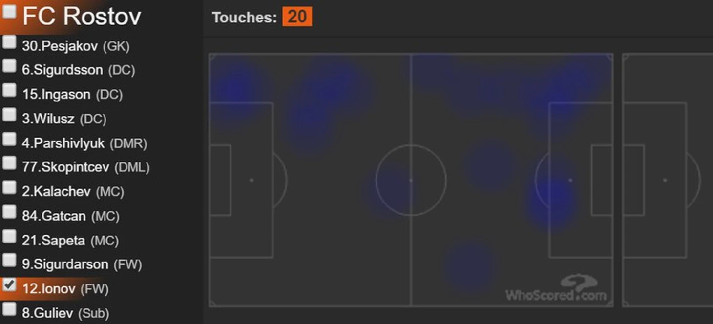 Тепловая карта футболистов отчетливо подтверждает мои слова из прошлого абзаца. Сапета играл очень низко, совсем не выдвигался вперед, только изредка смещался закрыть зону Паршивлюка. А вот Гацкан и Калачев были настоящим кулаком в центре поля. На двоих футболисты вступили в 30(!!!) единоборств — это очень высокий показатель. К слову, активная игра Гацкана не позволила Скопинцеву проявить свой атакующий потенциал, но это еще одна задумка главного тренера. Молодой талант в этом матче играл низко, чаще всего составляя оборонительную линию из четырех футболистов(Сигурдссон, Ингасон,Вилюш, Скопинцев) и Сапеты. Такой маневр Карпина не позволял нашей обороне проваливаться под натиском питерской атаки.