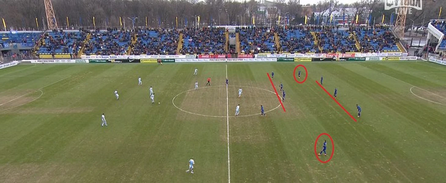 Отчетливо видно, что команда вышла играть по схеме 3-5-2, как и туром ранее. Возможно, я понимаю, что имел в виду Карпин, когда говорил о 5-4-1, поэтому постараюсь донести его мысль до вас.