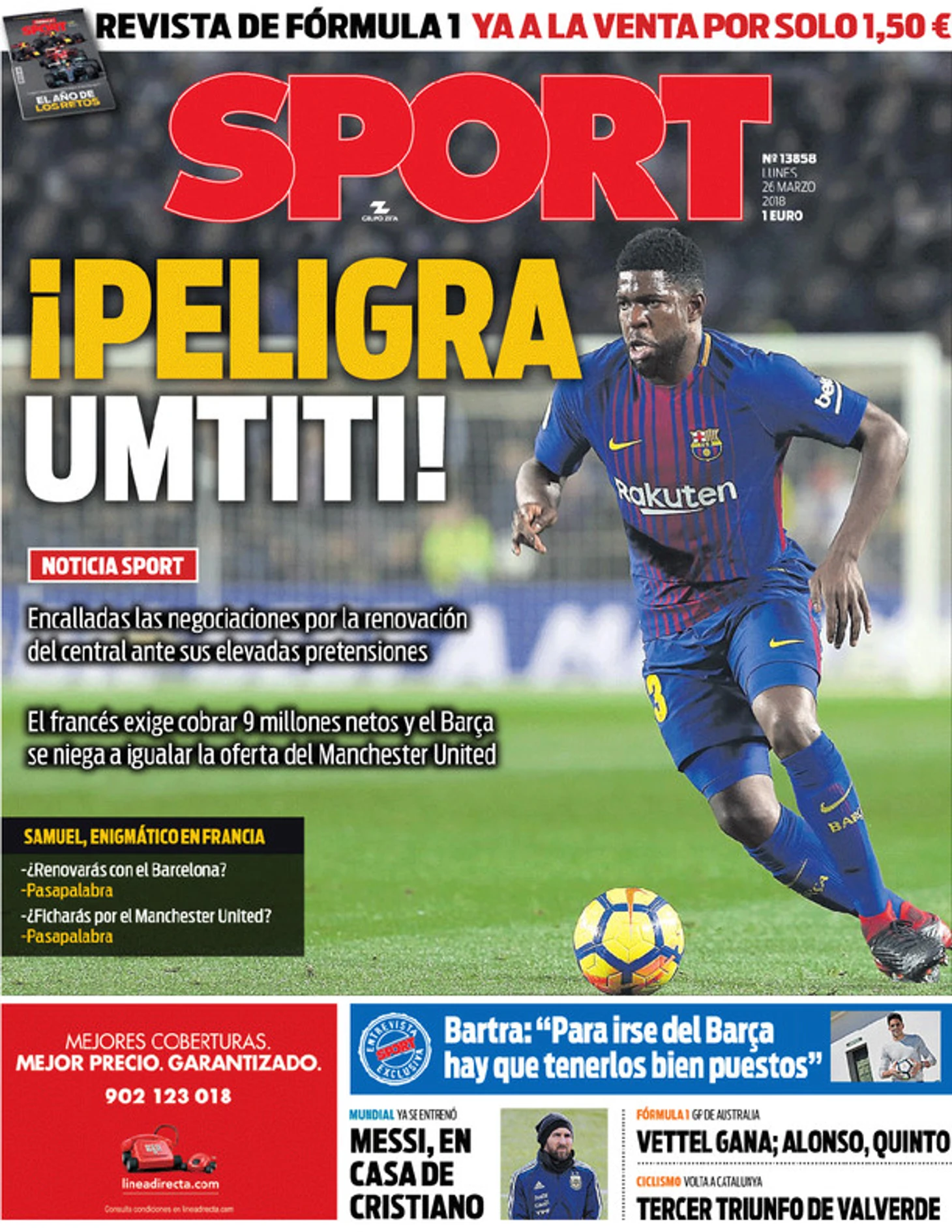 В понедельник утром, каталонский еженедельник Sport посвятил свой выпуск центральному защитнику из Барселоны – Самуэлю Умтити. «Умтити на грани исчезновения» заголовок газеты, гласящий о том, что переговоры с бывшим игроком «Лиона» не удались. Главной проблемой является заработная плата футболиста сборной Франции (24 года, 15 игр). Игрок потребовал зарплату 9 миллионов евро в год, но «Барселона» отказывается платить столько игроку, сколько мог бы платить «Манчестер Юнайтед».