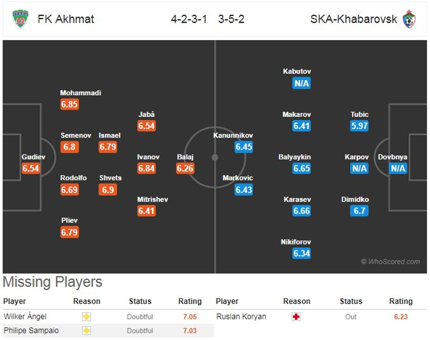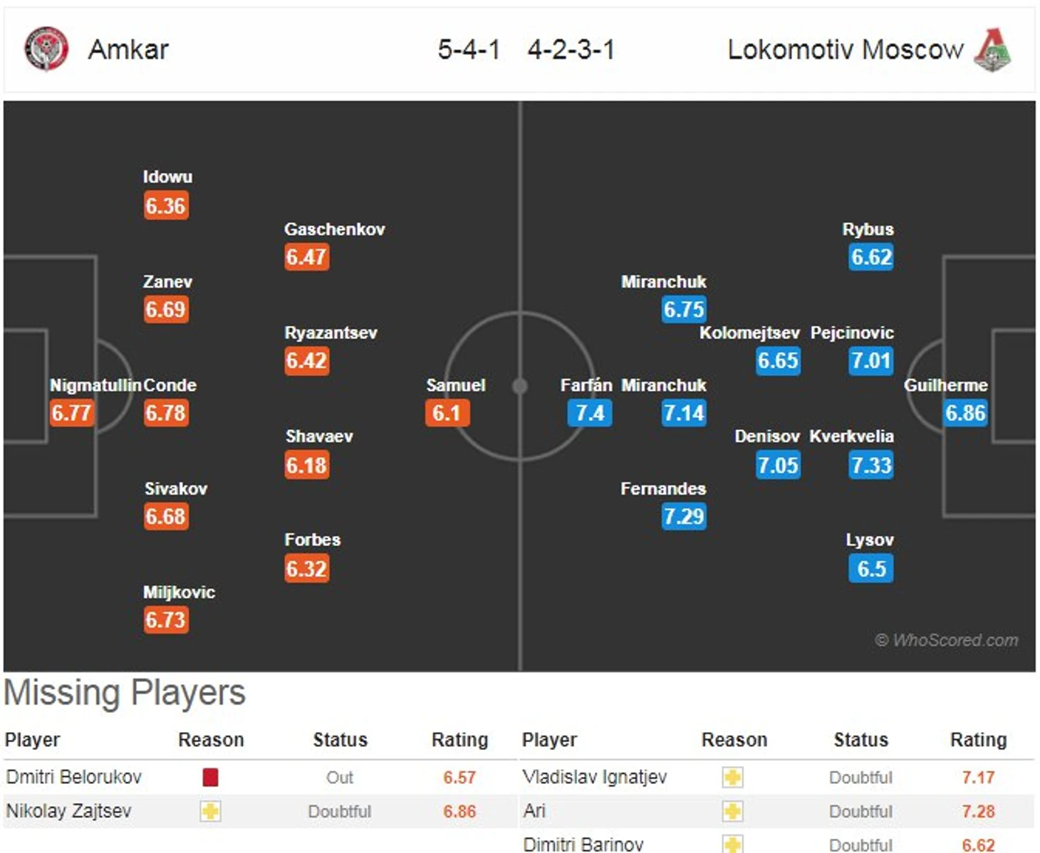 Потери: Ванек (травм.), Игбун, Кротов, Тумасян (все - под вопросом)- Оздоев (дисквал.), Кокорин,Маммана (оба - травм.), Кузяев, Паредес, Терентьев (все - под вопросом)