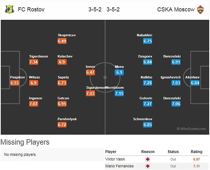 ЦСКА: Акинфеев - Набабкин, В.Березуцкий, Игнашевич, Вернблум, Щенников - Дзагоев, Натхо, Головин - Муса, Витинью