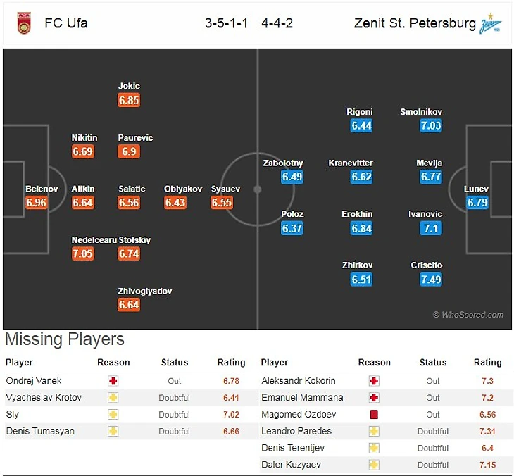 «Уфа»: Беленов - Живоглядов, Неделчару, Табидзе, Никитин, Йокич - Пауревич, Салатич, Стоцкий - Обляков - Сысуев.