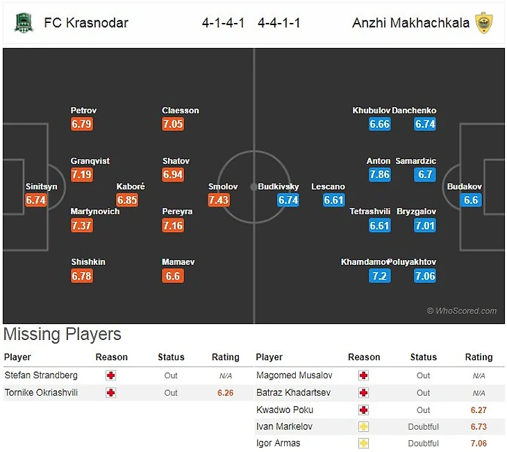«Краснодар»: Синицын - ШИШКИН, Мартынович, Гранквист, Петров - Каборе - Мамаев, ПЕРЕЙРА, Шатов, Классон - Смолов.