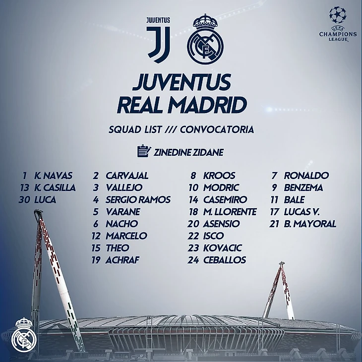 Зинедин Зидан заявил всех игроков на первый матч 1/4 финала Лиги Чемпионов против «Ювентуса».