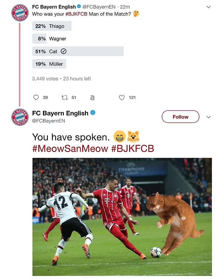 После истории на игре с «Бешикташем» кот начал периодически появляться в соцсетях «Баварии».