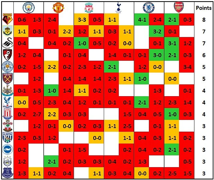 Успешнее других с командами из топ-6 на данный момент играли «Уотфорд», «Суонси» и «Бернли».