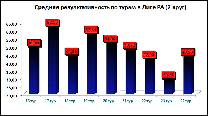 После 24-го тура в прошлых сезонах максимальный результат в Лиге РА был: