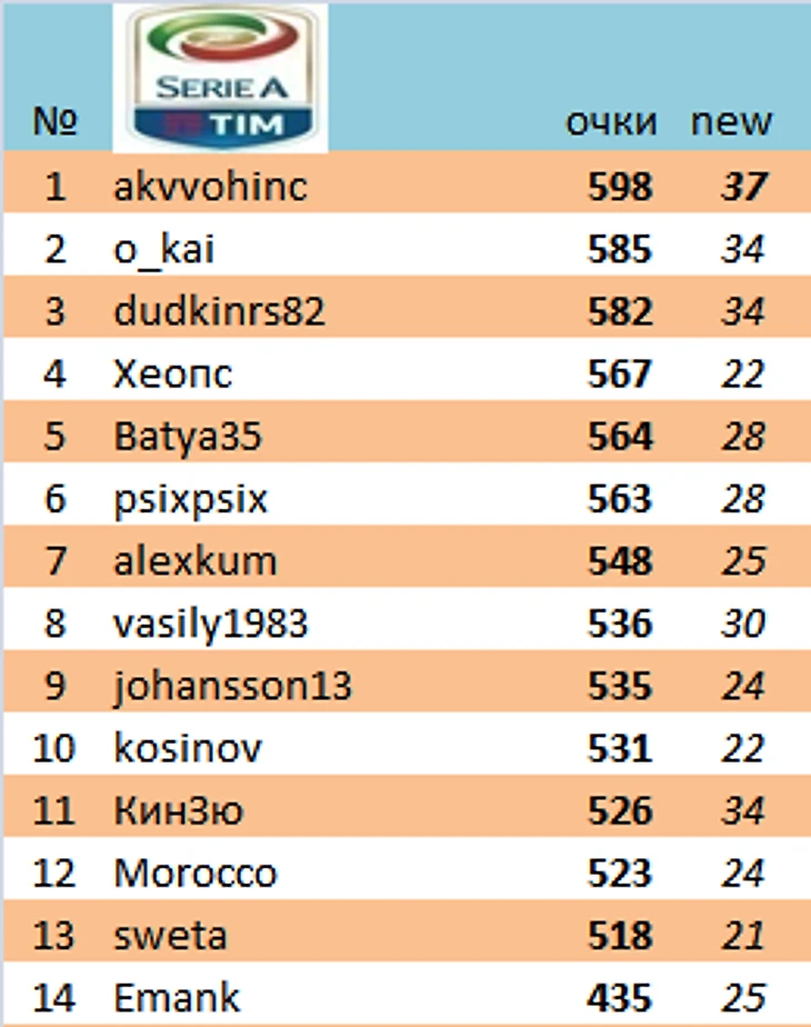 В Италии в яблочко выстрелил akvvohinc (37 очков)