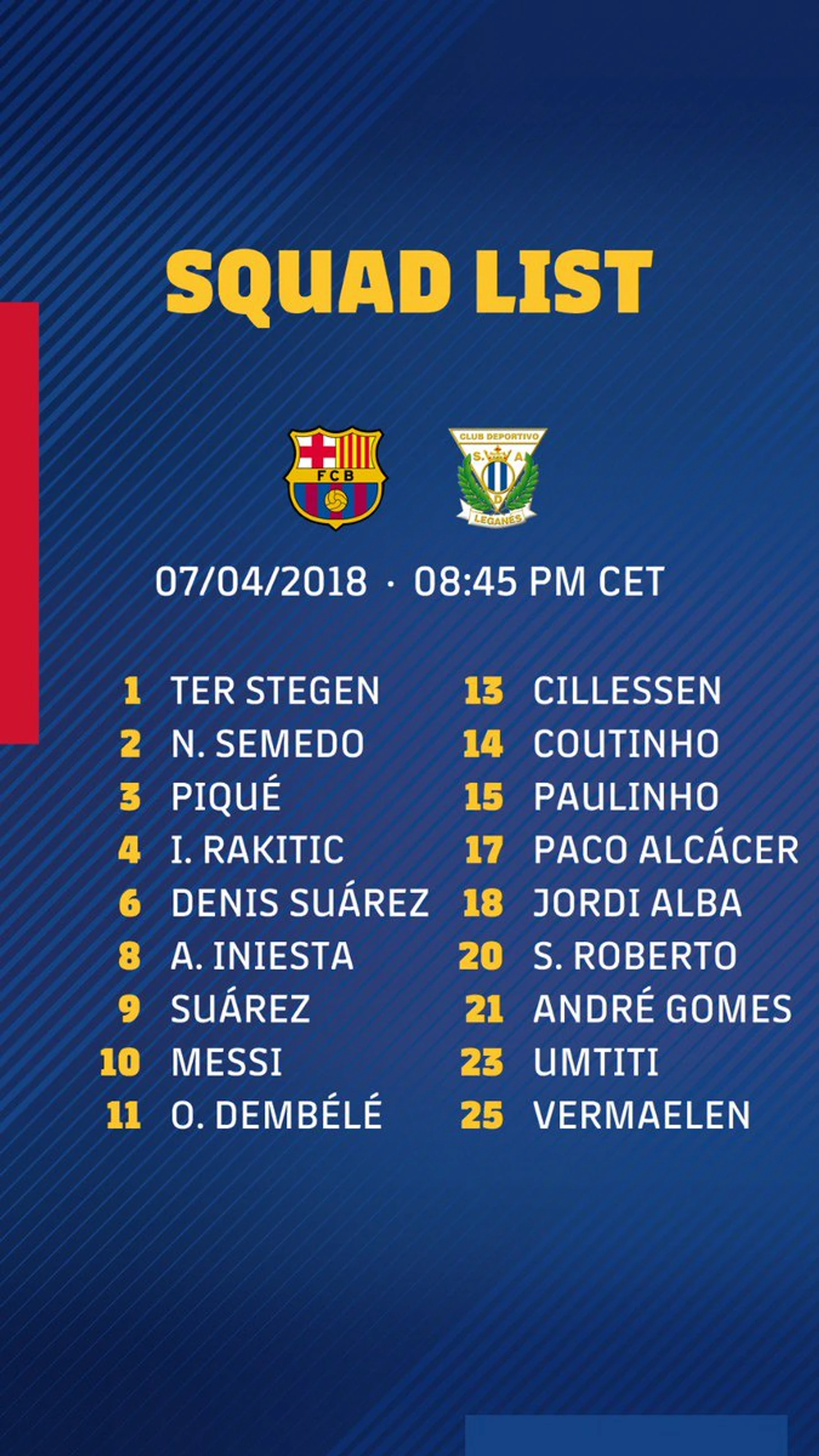 Заявка "Барселоны": тер Штеген, Силлессен, Семеду, Серхи Роберто, Пике, Умтити, Вермален, Альба, Ракитич, Иньеста, Коутиньо, Паулиньо, Андре Гомеш, Усман Дембеле, Месси, Алькасер, Денис Суарес, Луис Суарес.