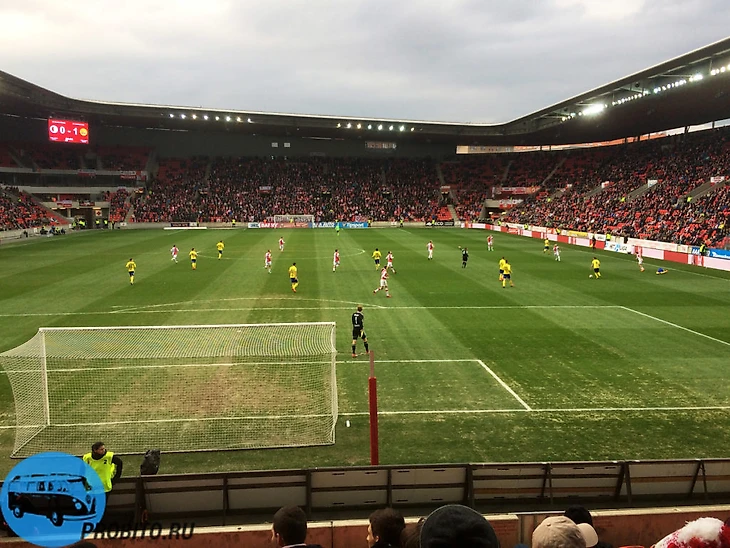 Досмотр был лайтовым и до своего сектора мы добрались без проблем. На входе к местам нас даже не окликнул стюард, чтобы сверить билет. Хотя это было сделать трудно, ведь руки были загружены колбасками и пивом :) Внутри стадиона вы можете ходить кругами и даже перейти на места получше (если таковы будут). В первом тайме мы сидели ближе к гостевому сектору «Злина» и долго угарали с их шизы. Чуваки, проделавшие не близкий путь по меркам Чехии (~300 километров), шизили не только по торсу, но и вообще раздевались до трусов. Шоб вы понимали, в этот день в Праге было около семи градусов тепла, ветер и местами крапал дождь. Однако некоторых из приличного злинского десанта это ни капли не смущало. Оголялись парни даже во время развеса своих тряпок :) и искренняя жгучесть сразу дошла до футболистов из Злина, которые первым ударом открыли счёт в матче.