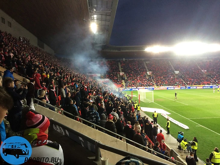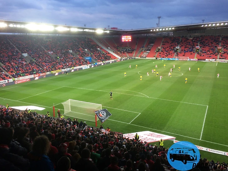 Фанка «Славии» заполнилась практически целиком и заправляла тон центральным трибунам. «Славия», которая находится в гонке за первым местом, после пропущенного мяча зажала соперника на их половине и в середине тайма заработала пенальти, который не реализовала. Трибуны схватились за головы, но спустя несколько минут уже взметнули кулаки вверх — пражский клуб всё-таки сравнивает счёт.