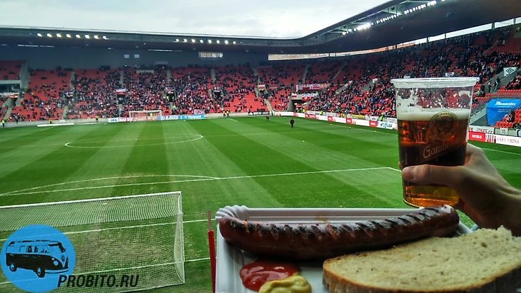 В день игры работают временные фуд-корты, где можно купить колбаску с хлебушком (60 крон) и пиво за 45 крон. Вообще, пиво у чехов дешевле всего (даже картошки). На стадионе оно дешевле, чем перед стадионом (40 крон(!) и даже дешевле газированных напитков на стадионе, которые отпускают за 50 крон. Стоит отметить работу фуд-кортов на стадионе. Персонал за прилавком на небольшом участке умудряется разливать пиво, жарить колбаски, готовить кофе (на выбор растворимый или эспрессо из кофе-машины) или чай. Все быстро и круто! Просто приятно было наблюдать за этим процессом.