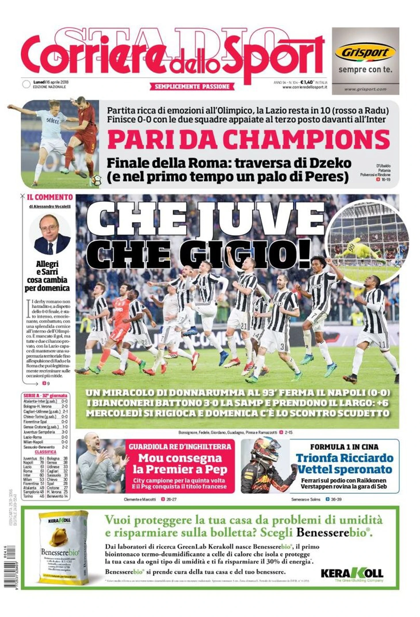Матч богатый на эмоции на «Олимпико», «Лацио» остался в 10-ом (красная Раду). Всё завершилось 0:0, с двумя командами, парой поднявшимися на третье место над «Интером». Концовка была за «Ромой»: перекладина Джеко (и в первом тайме штанга Переса).