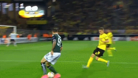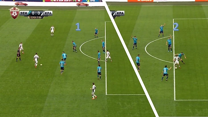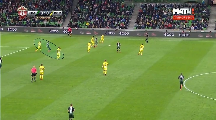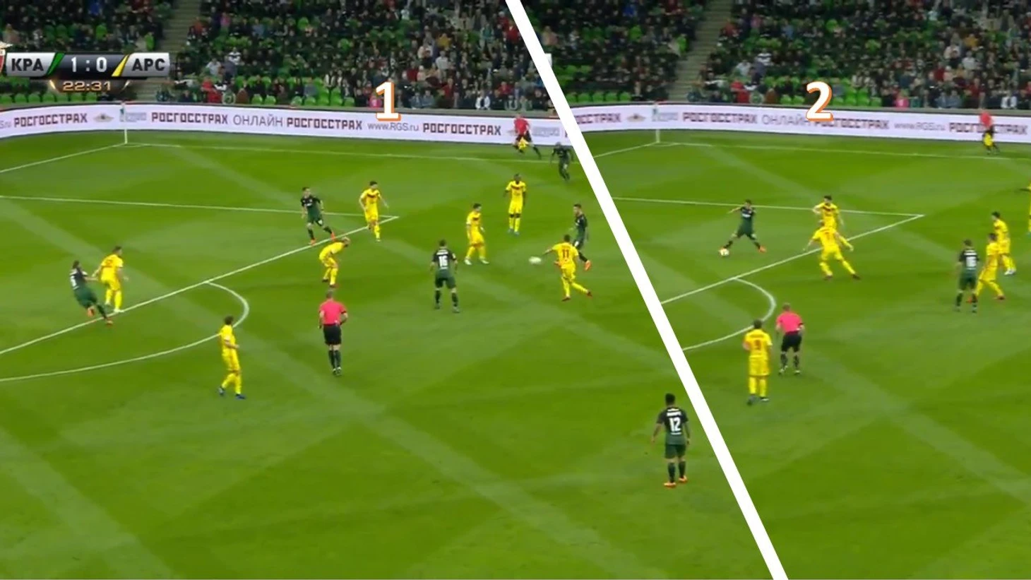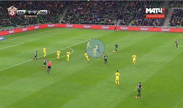 Для примера я взял два момента из игры Краснодара против Ростова. В обоих случаях Смолов ищет позицию в центре атаки для того, чтобы открыться. Однако всегда оказывается под опекой сразу же нескольких игроков в желтой форме.