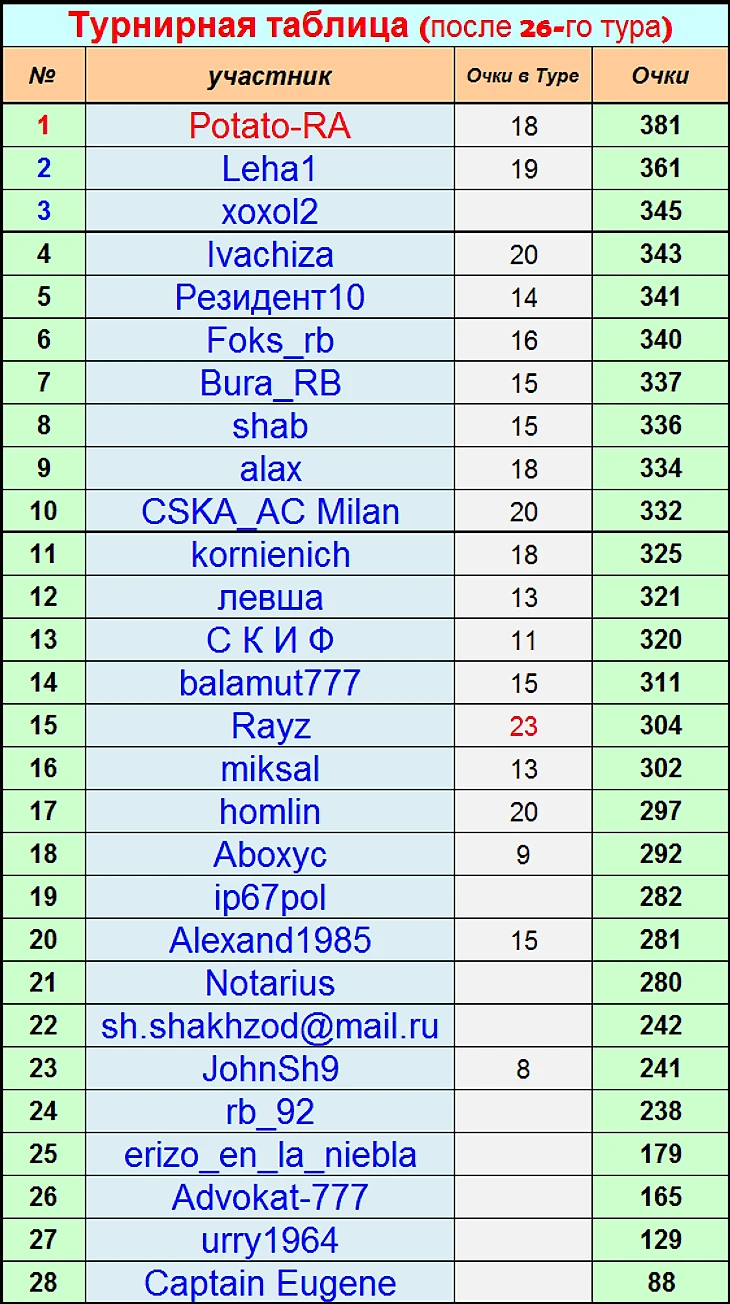Турниры по прогнозам РФПЛ 2017-2018. Итоги тура №26