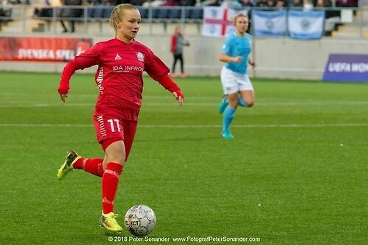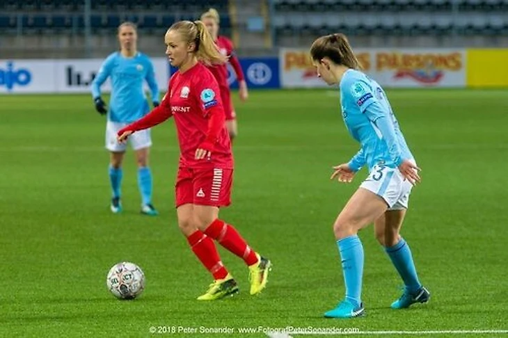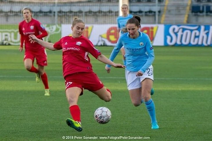 На 74-ой минуте в атаке шведок Фрида Маанум из-за пределов штрафной зарядила выше цели. На 77-ой минуте в затяжной атаке красных, с пределов штрафной после паса Элин Ландстрем, активная Альмквист прошла сквозь гущу игроков и с острого угла с ближней дистанции закатила мяч в сетку рамы Ройбак – 3:5. После этого гола хозяек, последние минуты матча проходили в инициативе голубых, и они были ближе к еще одному голу. На 78-ой минуте после атаки «горожанок» по левому флангу все завершилось ударом с пределов штрафной Клэр Эмсли точно в руки Карлен. На 86-ой минуте в еще одной атаке голубых, Эмсли на скорости прострелила в штрафную, где Кристиансен неплохо пробила, но Карлен была начеку, отбив мяч на корнер. Так, в атаках футболисток ЖФК «Манчестер сити» игра и подошла к своему завершению, а счет 3:5 в пользу гостей стал итоговым!