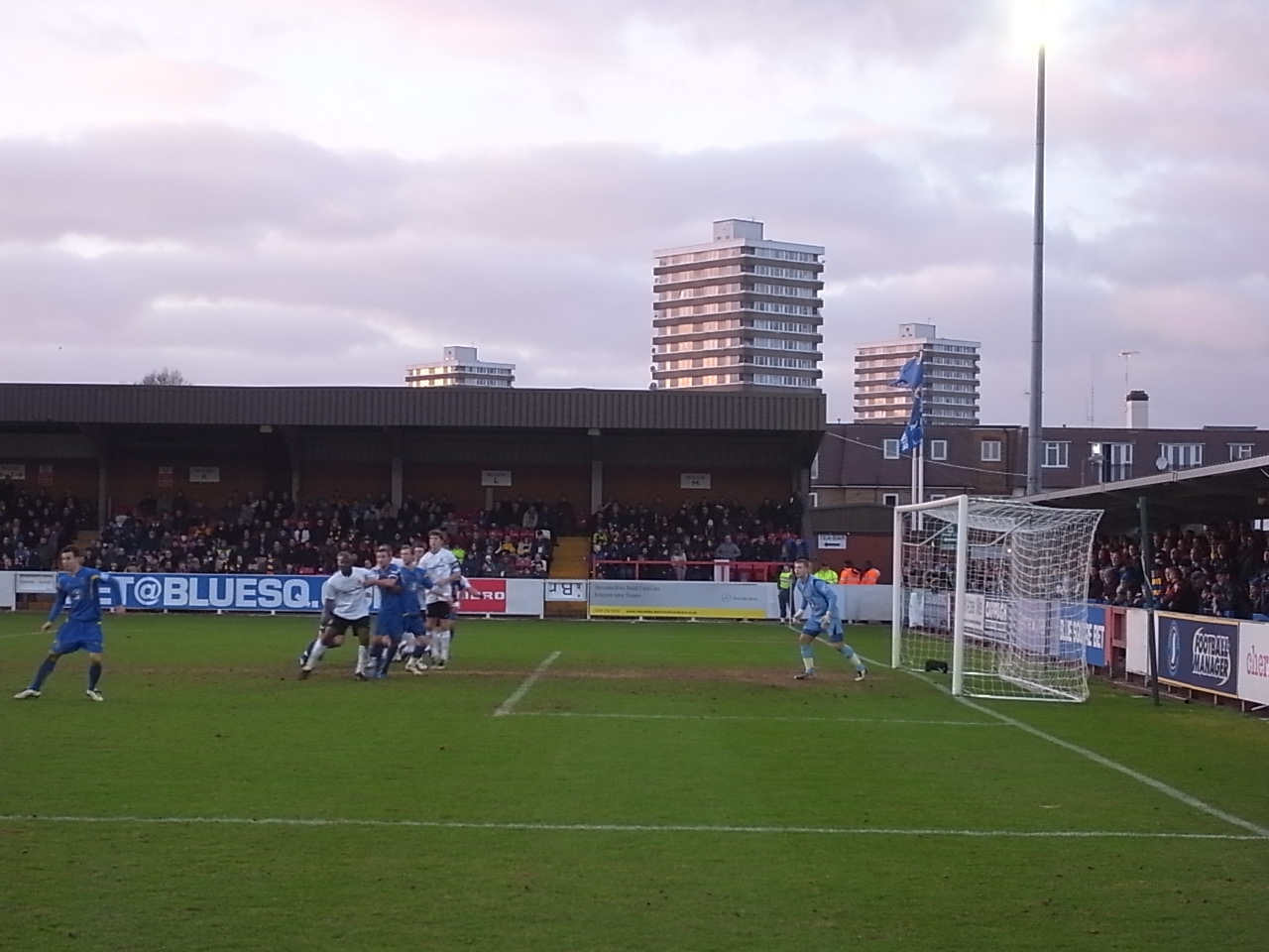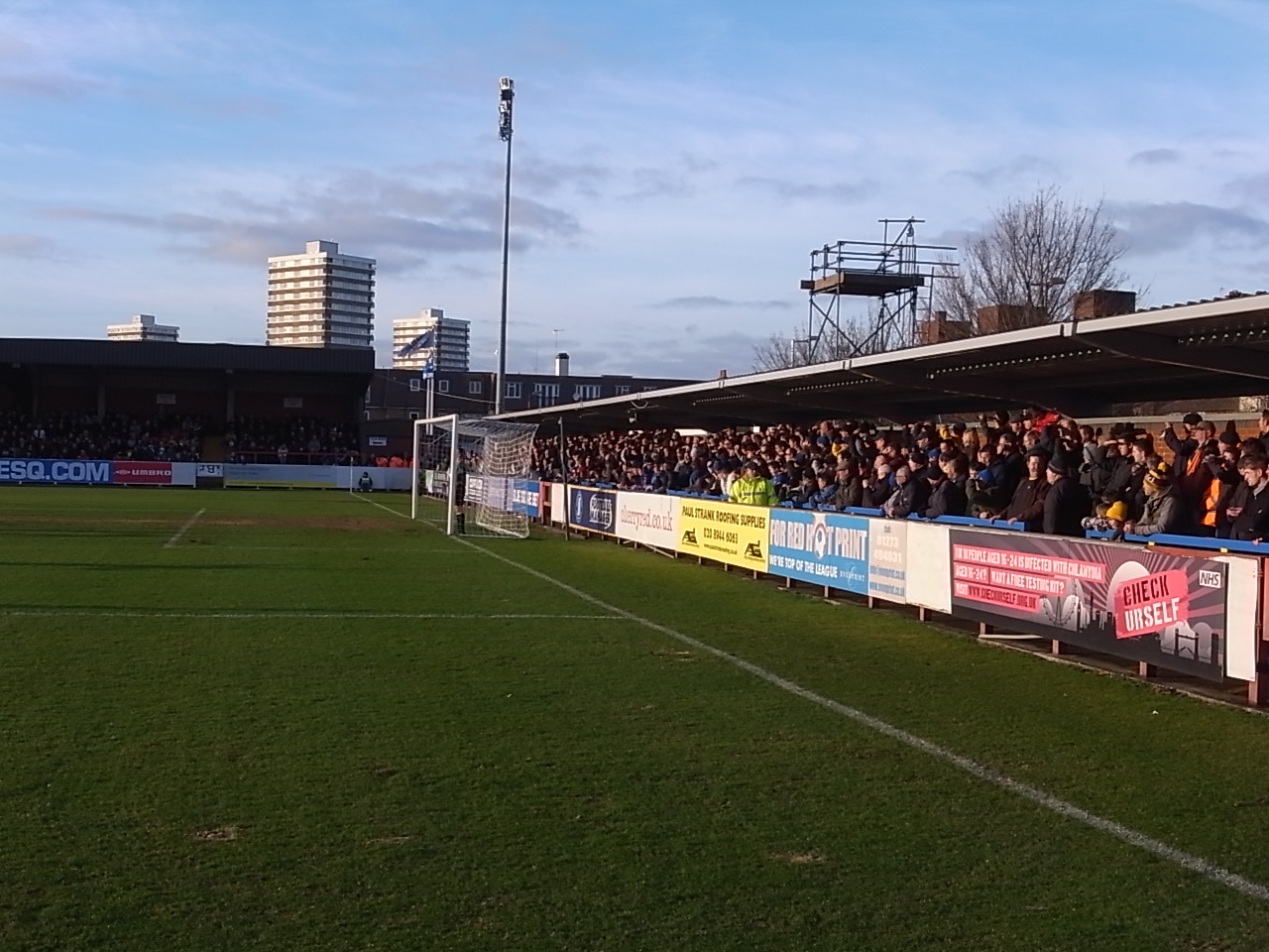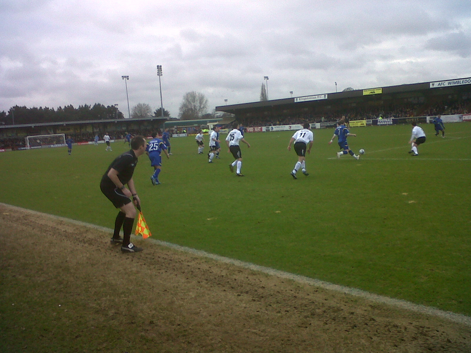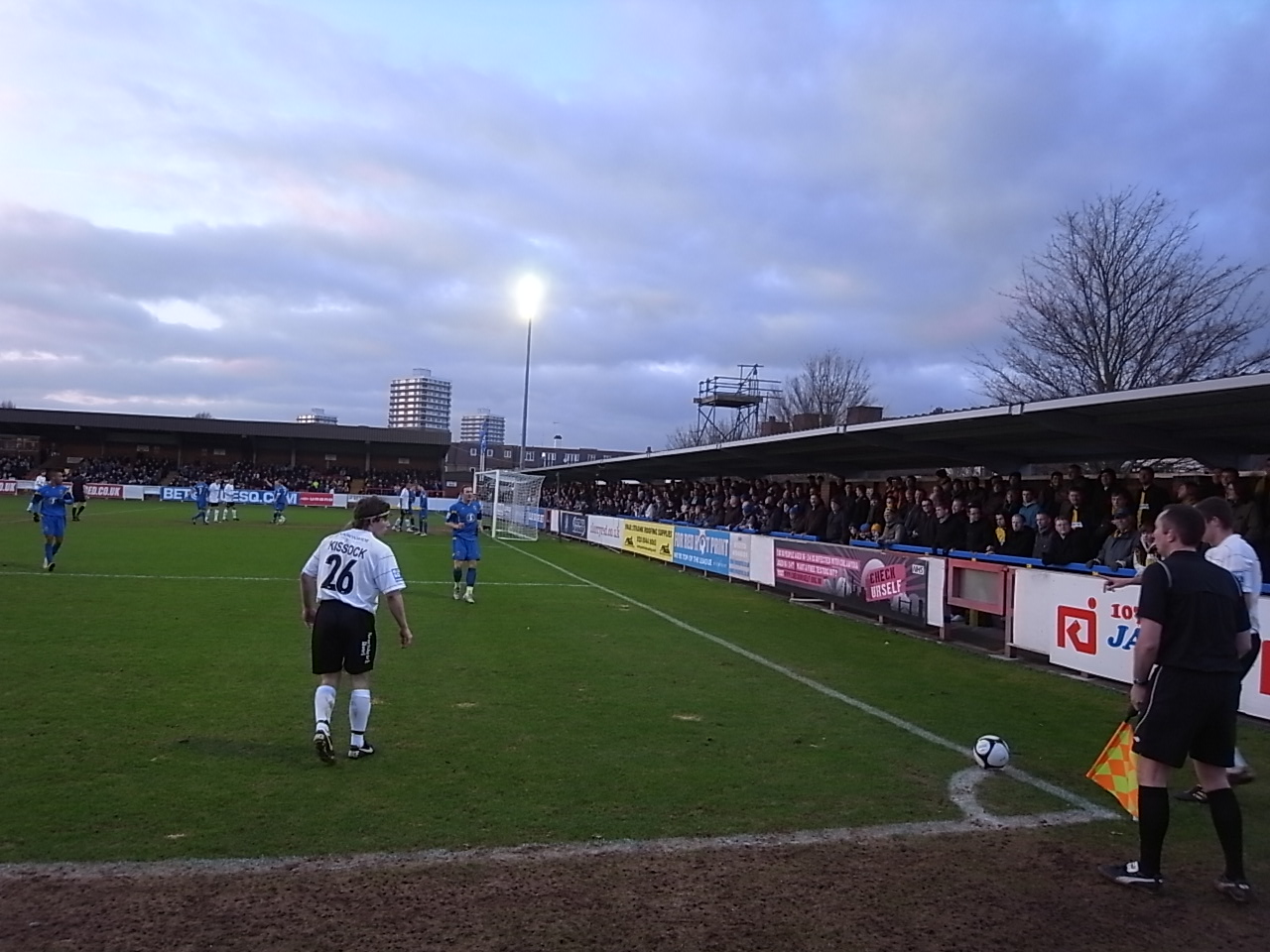 Они старались весь матч скандировать по ситуации, но массовое хоровое пение в этом футбольном мирке штука редкая. Я расположился у углового флажка у забора вдоль поля. Справа - Кингстон Роуд Энд, слева - Джон Смитс Террэс.