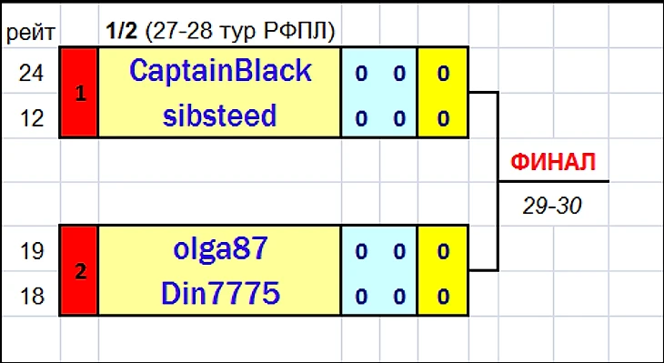 Пару слов о полуфиналистах Кубка ФФ... Ольга olga87 единственная из претендентов на Кубок, кто выигрывал его (в сезоне 15/16)... Алексей Din7775, набравший отличную форму на финише, впервые играет в кубковом турнире Лиги РА... Сергей sibsteed дважды останавливался на начальных стадиях 1/16, а Вахид CaptainBlack добирался только до стадии 1/8 турнира... так что у 3-х участников уже рекордный поход кубковый, но каждый из них хочет еще большего... у Оли же есть шанс стать первой двухкратной обладательницей Кубка ФФ... а пока еще только полуфиналы...