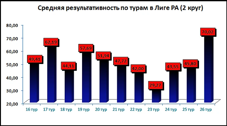 После 26-го тура в прошлых сезонах максимальный результат в Лиге РА был:
